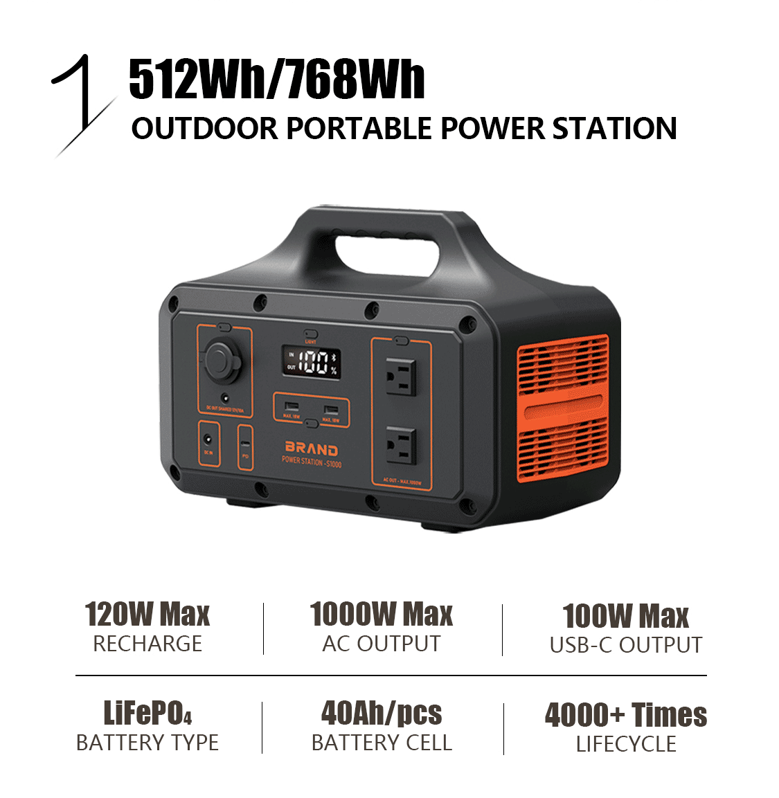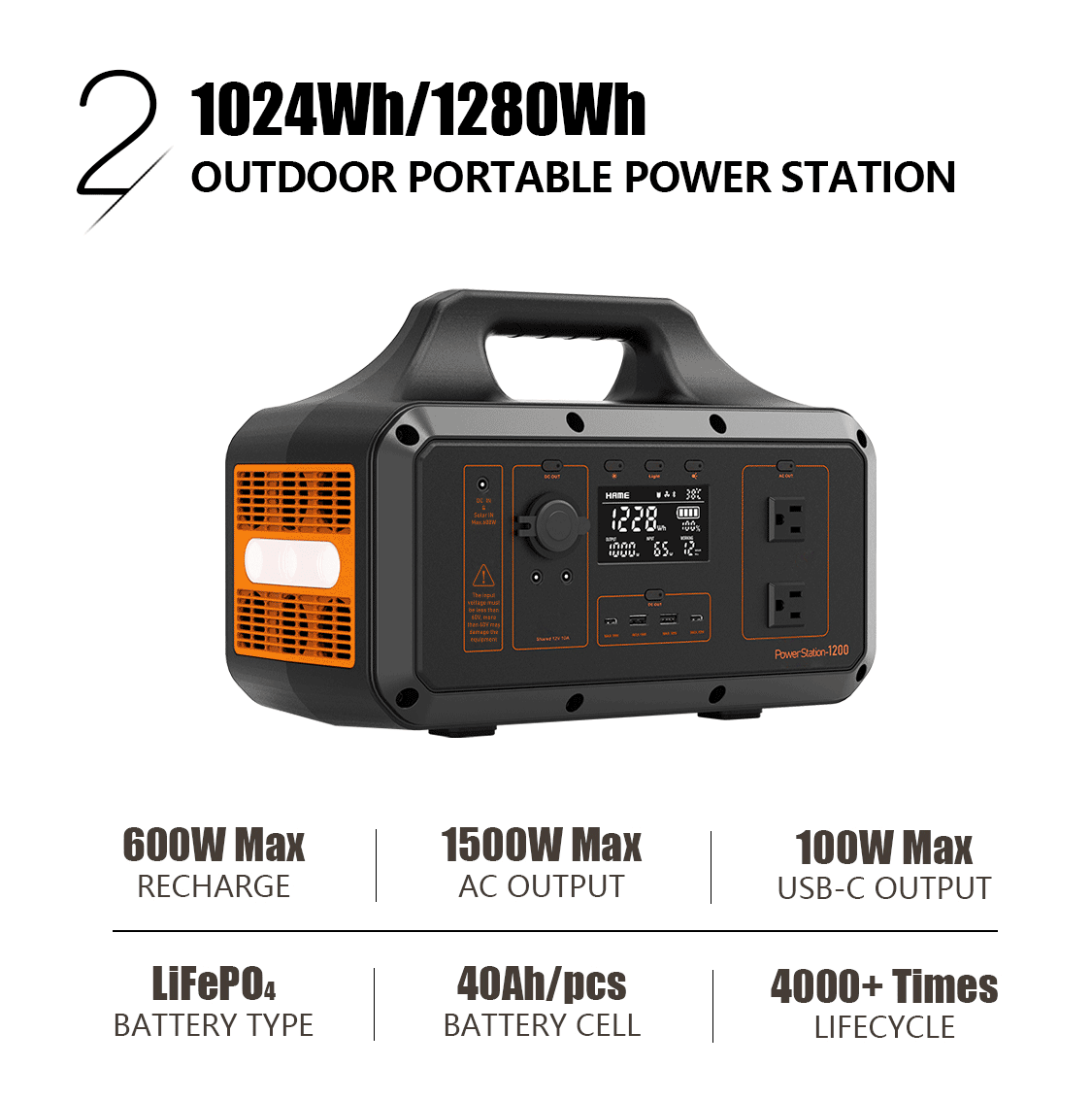 电池采用自研40Ah大单体磷酸铁锂电芯,拥有4000+次超长循环寿命,内阻小于0.5毫欧。对比相同容量产品,所需电芯数量更少,降低电芯均衡、温控等电池管理难度,整体性能更加安全可靠。 户外电源产品容量规格多样性,输出功率有大有小,可覆盖众多用电场景,比如露营、路演、户外工程、长途旅行、房车生活等。